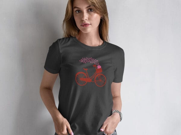 Design Exclusivo: A T-shirt Bike com Coração apresenta um design encantador que reflete sua paixão pelo ciclismo, perfeito para as mulheres que amam pedalar com estilo.